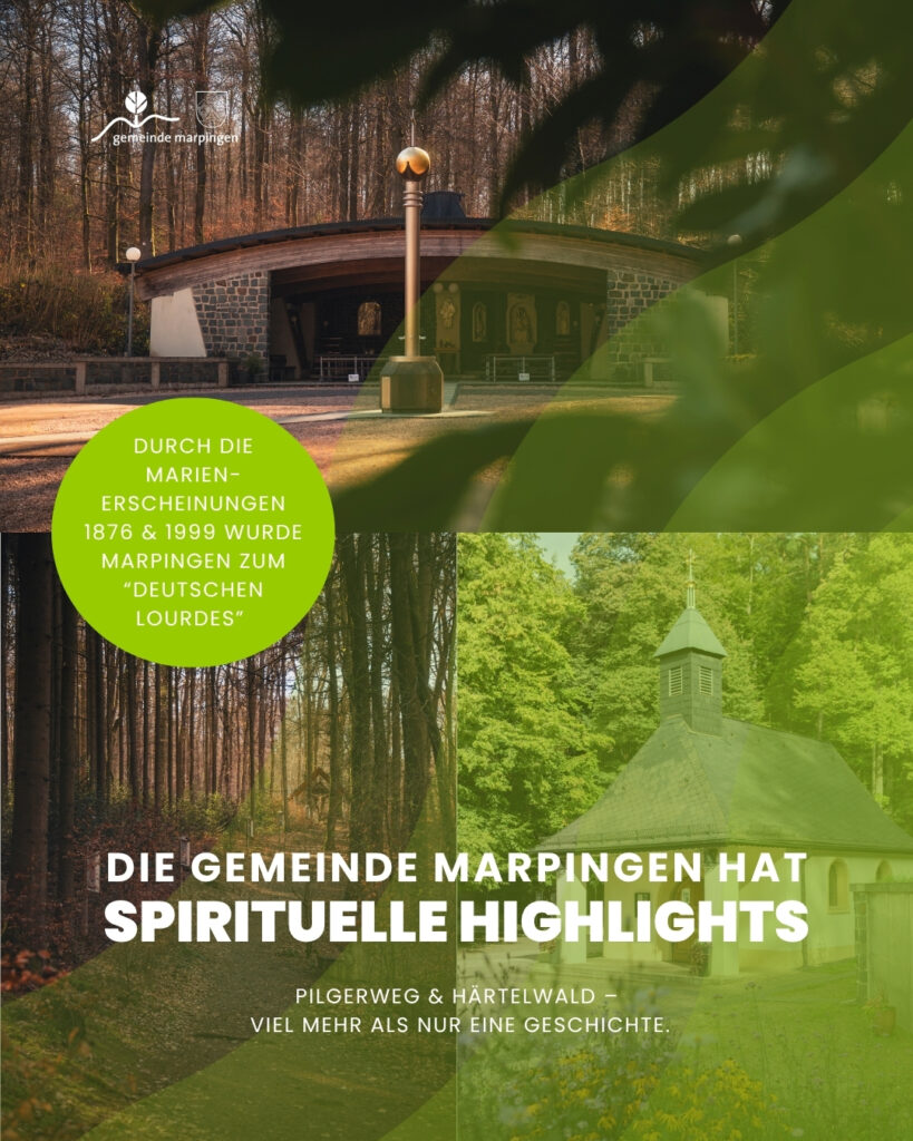 Der Härtelwald ist ein historischer Pilgerort mit langer Tradition der Marienverehrung. Besonders bekannt ist Marpingen durch die Erscheinungen von 1876, als drei Kinder die Gottesmutter sahen, und von 1999, als erneut mehrere Menschen von Marienerscheinungen berichteten. Auch wenn die Kirche diese Ereignisse nicht offiziell bestätigte, prägen sie bis heute die Pilgertradition in Marpingen. Besucherinnen und Besucher können hier Einkehr, Gebet und Besinnung erleben, eingebettet in eine ruhige, naturnahe Umgebung.