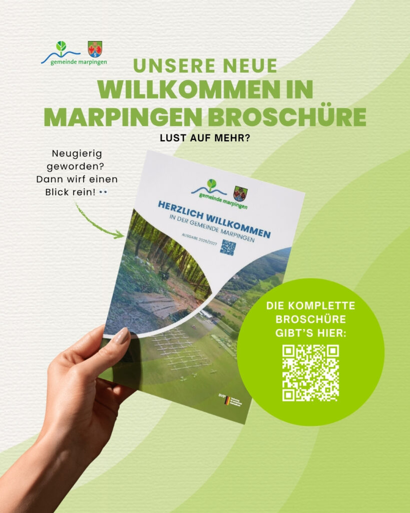 Unsere neue Broschüre „Willkommen in Marpingen“ fasst alle Highlights kompakt zusammen: Geschichte, Natur, Kultur, Freizeitmöglichkeiten und Angebote für Jung und Alt. Sie lädt zum Entdecken ein, ob für Einheimische oder Besucher.